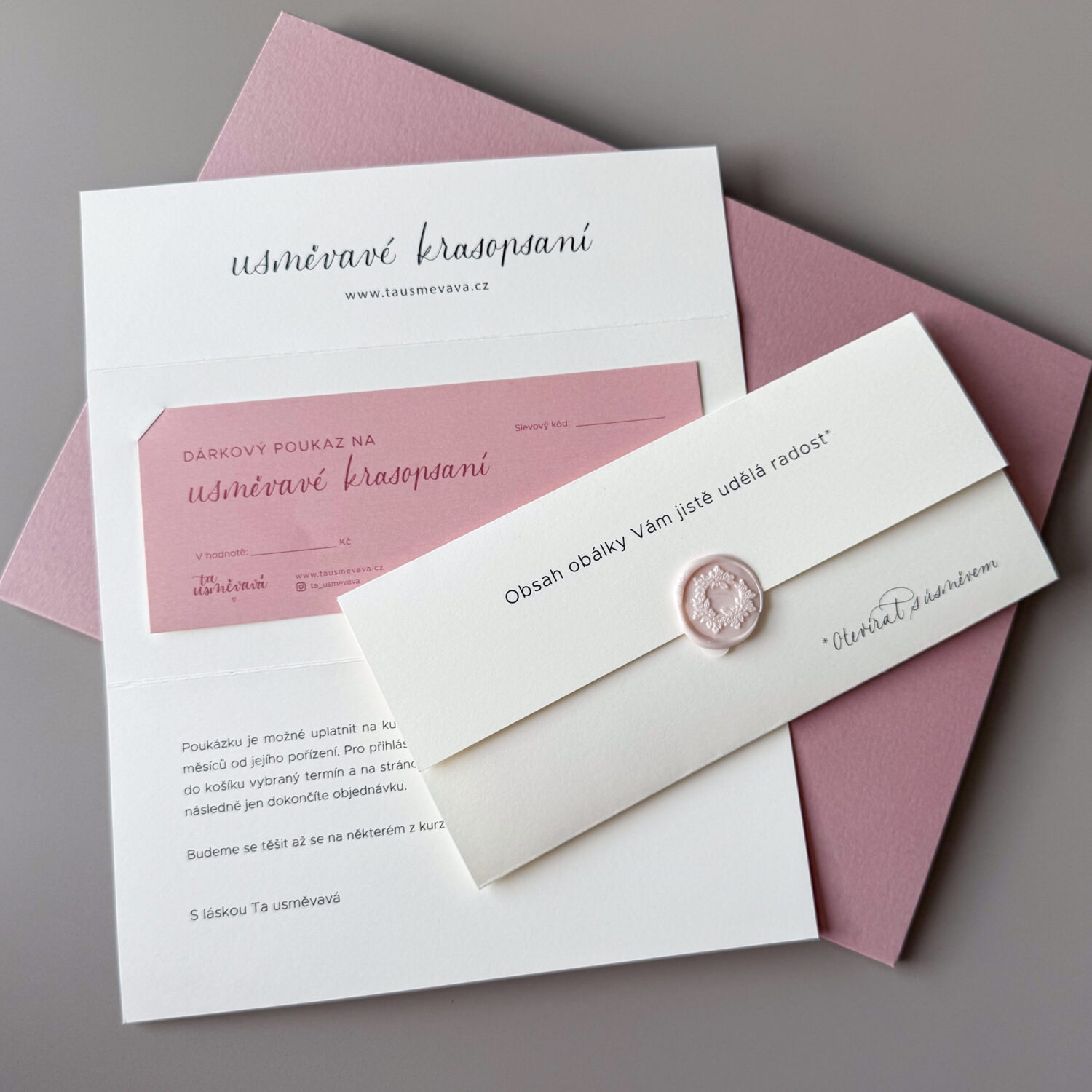 Styl poukazu je univerzální a je na něm ručně vypsána hodnota poukazu, slevový kód a datum expirace. Osobní věnování se propíše pouze do PDF verze poukazu.